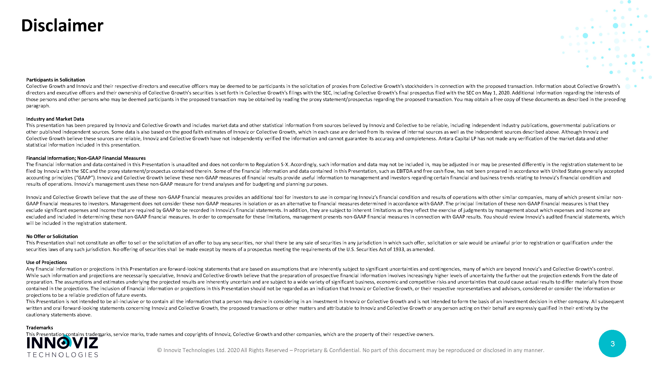 2 2 © Innoviz Technologies Ltd. 2020 All Rights Reserved – Proprietary & Confidential. No part of this document may be reproduced or disclosed in any manner. Disclaimer This presentation (this “Presentation”) is provided for informational purposes only and has been prepared to assist intereste d p arties in making their own evaluation with respect to a potential business combination between Innoviz Technologies Ltd. (“th e “ Company” or “Innoviz”) and Collective Growth Corporation (“Collective Growth”) and related transactions (the “Proposed Business Combinati on” ) and for no other purpose. No representations or warranties, express or implied are given in, or respect of, this Presentation. To the fullest extent pe rmi tted by law, in no circumstances will Innoviz, Collective Growth, Antara Capital LP or any of their respective subsidiaries, stockholders, affiliates, representatives, partners, directors, officers, employees, advisers or agents be responsible or liable for any direct, indire ct or consequential loss or loss of profit arising from use of this Presentation, its contents, its omissions, reliance on the i nfo rmation contained within it, or on opinions communicated in relation thereto or otherwise arising in connection therewith. This Presentation does not pur port to be all - inclusive or to contain all of the information that may be required to make a full analysis of Innoviz or the Pro posed Business Combination. Viewers of this Presentation should each make their own evaluation of Innoviz and of the relevance and adequacy of the information and should make such other investigations as they deem necessary. Forward - Looking Statements This Presentation contains certain forward - looking statements within the meaning of the federal securities laws with respect to the proposed transaction between Innoviz and Collective Growth, including statements regarding the benefits of the transactio n, the anticipated timing of the transaction, the services offered by Innoviz and the markets in which it operates, and Innoviz’s projected future results. These forward - looking statements generally are identified by the words “believe,” “project,” “expect, ” “anticipate,” “estimate,” “intend,” “strategy,” “future,” “opportunity,” “plan,” “may,” “should,” “will,” “would,” “will be,” “will continu e,” “will likely result,” and similar expressions. Forward - looking statements are predictions, projections and other statements abo ut future events that are based on current expectations and assumptions and, as a result, are subject to risks and uncertainties. Many factors co uld cause actual future events to differ materially from the forward - looking statements in this Presentation, including but not limited to: ( i ) the risk that the transaction may not be completed in a timely manner or at all, which may adversely affect the price of Collecti ve Growth’s securities, (ii) the risk that the transaction may not be completed by Collective Growth’s business combination dead lin e and the potential failure to obtain an extension of the business combination deadline if sought by Collective Growth, (iii) the failu re to satisfy the conditions to the consummation of the transaction, including the adoption of the business combination agreemen t b y the shareholders of Collective Growth and Innoviz, the satisfaction of the minimum trust account amount following redemptions by Col lective Growth’s public shareholders and the receipt of certain governmental and regulatory approvals, (iv) the lack of a thi rd party valuation in determining whether or not to pursue the proposed transaction, (v) the occurrence of any event, change or other cir cumstance that could give rise to the termination of the business combination agreement, (vi) the effect of the announcement or pendency of the transaction on Innoviz’s business relationships, performance, and business generally, (vii) risks that the proposed transaction disrupts current plans o f Innoviz and potential difficulties in Innoviz employee retention as a result of the proposed transaction, (viii) the outcome of any legal proceedings that may be instituted against Innoviz or against Collective Growth related to the business com bination agreement or the proposed transaction, (ix) the ability of Innoviz to list its ordinary shares on the Nasdaq, (x) th e p rice of Innoviz’s securities may be volatile due to a variety of factors, including changes in the competitive and highly regulated industries in which Innoviz plans to operate, variations in performance across competitors, changes in laws and regulations affecting Innoviz’s business and changes in the combined capital structure, and (xi) the ability to implement business plans, forecasts, and other expectation s a fter the completion of the proposed transaction, and identify and realize additional opportunities. The foregoing list of fac tor s is not exhaustive. You should carefully consider the foregoing factors and the other risks and uncertainties described in the “Risk Factors” sec tio n of Collective Growth’s Annual Reports on Form 10 - K, Quarterly Reports on Form 10 - Q, and other documents filed by Collective Gr owth from time to time with the U.S. Securities and Exchange Commission (the “SEC”) and the registration statement on Form F - 4 and proxy s tatement/prospectus discussed below. These filings identify and address other important risks and uncertainties that could ca use actual events and results to differ materially from those contained in the forward - looking statements. Forward - looking statements speak only as of the date they are made. Readers are cautioned not to put undue reliance on forward - looking statements, and Innoviz a nd Collective Growth assume no obligation and do not intend to update or revise these forward - looking statements, whether as a resu lt of