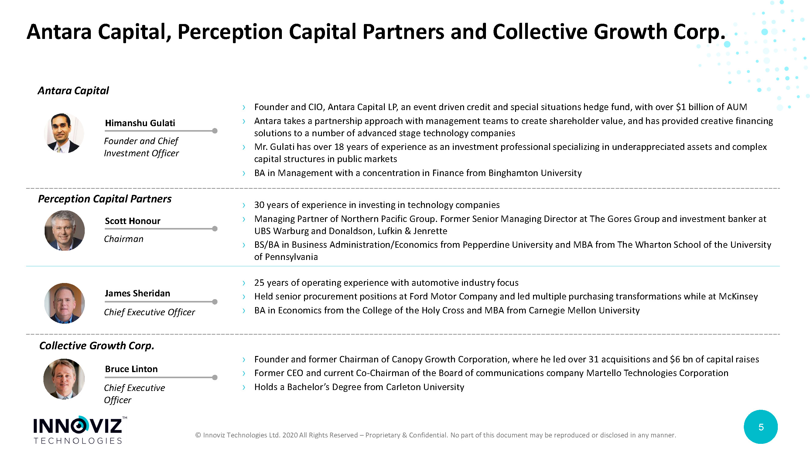 3 3 © Innoviz Technologies Ltd. 2020 All Rights Reserved – Proprietary & Confidential. No part of this document may be reproduced or disclosed in any manner. Disclaimer Participants in Solicitation Collective Growth and Innoviz and their respective directors and executive officers may be deemed to be participants in the s oli citation of proxies from Collective Growth’s stockholders in connection with the proposed transaction. Information about Coll ect ive Growth’s directors and executive officers and their ownership of Collective Growth’s securities is set forth in Collective Growth’s fi lin gs with the SEC, including Collective Growth’s final prospectus filed with the SEC on May 1, 2020. Additional information reg ard ing the interests of those persons and other persons who may be deemed participants in the proposed transaction may be obtained by reading the pro xy statement/prospectus regarding the proposed transaction. You may obtain a free copy of these documents as described in the pr ece ding paragraph. Industry and Market Data This presentation has been prepared by Innoviz and Collective Growth and includes market data and other statistical informati on from sources believed by Innoviz and Collective to be reliable, including independent industry publications, governmental pub lic ations or other published independent sources. Some data is also based on the good faith estimates of Innoviz or Collective Growth, whi ch in each case are derived from its review of internal sources as well as the independent sources described above. Although Inn ovi z and Collective Growth believe these sources are reliable, Innoviz and Collective Growth have not independently verified the infor mat ion and cannot guarantee its accuracy and completeness . Antara Capital LP has not made any verification of the market data and other statistical information included in this presentation. Financial Information; Non - GAAP Financial Measures The financial information and data contained in this Presentation is unaudited and does not conform to Regulation S - X. According ly, such information and data may not be included in, may be adjusted in or may be presented differently in the registration sta tement to be filed by Innoviz with the SEC and the proxy statement/prospectus contained therein. Some of the financial information and dat a c ontained in this Presentation, such as EBITDA and free cash flow, has not been prepared in accordance with United States gene ral ly accepted accounting principles (“GAAP”). Innoviz and Collective Growth believe these non - GAAP measures of financial results provide usefu l information to management and investors regarding certain financial and business trends relating to Innoviz’s financial condition and results of operations. Innoviz’s management uses these non - GAAP measure for trend analyses and for budgeting and planning purposes. Innoviz and Collective Growth believe that the use of these non - GAAP financial measures provides an additional tool for investor s to use in comparing Innoviz’s financial condition and results of operations with other similar companies, many of which present similar non - GAAP financial measures to investors. Management does not consider these non - GAAP measures in isolation or as an alternative to financial measures determined in accordance with GAAP. The principal limitation of these non - GAAP financial measures is that the y exclude significant expenses and income that are required by GAAP to be recorded in Innoviz’s financial statements. In addition, they are subject to inherent limitations as they reflect the exercise of judgments by mana ge ment about which expenses and income are excluded and included in determining these non - GAAP financial measures. In order to compensate for these limitations, management presents non - GAAP financial measures in connection with GAAP results. You should review Innoviz’s audited financial statements, which will be included in the registration statement. No Offer or Solicitation This Presentation shall not constitute an offer to sell or the solicitation of an offer to buy any securities, nor shall ther e b e any sale of securities in any jurisdiction in which such offer, solicitation or sale would be unlawful prior to registratio n o r qualification under the securities laws of any such jurisdiction. No offering of securities shall be made except by means of a prospectus meeting the re quirements of the U.S. Securities Act of 1933, as amended. Use of Projections Any financial information or projections in this Presentation are forward - looking statements that are based on assumptions that are inherently subject to significant uncertainties and contingencies, many of which are beyond Innoviz’s and Collective Growth’s control. While such information and projections are necessarily speculative, Innoviz and Collective Growth believe that the preparatio n o f prospective financial information involves increasingly higher levels of uncertainty the further out the projection extends fr om the date of preparation. The assumptions and estimates underlying the projected results are inherently uncertain and are subject to a wid e v ariety of significant business, economic and competitive risks and uncertainties that could cause actual results to differ ma ter ially from those contained in the projections. The inclusion of financial information or projections in this Presentation should not be regard ed as an indication that Innoviz or Collective Growth, or their respective representatives and advisors, considered or consider the information or projections to be a reliable prediction of future events. This Presentation is not intended to be all - inclusive or to contain all the information that a person may desire in considering in an investment in Innoviz or Collective Growth and is not intended to form the basis of an investment decision in either co mpa ny. All subsequent 