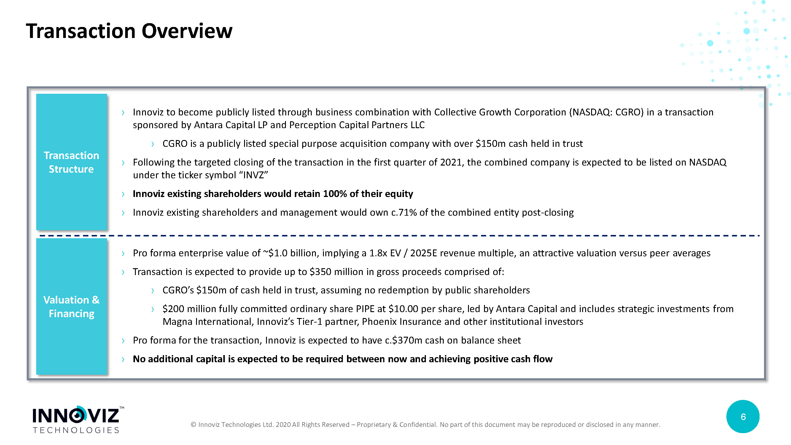 5 5 © Innoviz Technologies Ltd. 2020 All Rights Reserved – Proprietary & Confidential. No part of this document may be reproduced or disclosed in any manner. Scott Honour Chairman › 30 years of experience in investing in technology companies › Managing Partner of Northern Pacific Group. Former Senior Managing Director at The Gores Group and investment banker at UBS Warburg and Donaldson, Lufkin & Jenrette › BS/BA in Business Administration/Economics from Pepperdine University and MBA from The Wharton School of the University of Pennsylvania James Sheridan Chief Executive Officer › 25 years of operating experience with automotive industry focus › Held senior procurement positions at Ford Motor Company and led multiple purchasing transformations while at McKinsey › BA in Economics from the College of the Holy Cross and MBA from Carnegie Mellon University Bruce Linton Chief Executive Officer › Founder and former Chairman of Canopy Growth Corporation, where he led over 31 acquisitions and $6 bn of capital raises › Former CEO and current Co - Chairman of the Board of communications company Martello Technologies Corporation › Holds a Bachelor’s Degree from Carleton University Antara Capital, Perception Capital Partners and Collective Growth Corp . Perception Capital Partners Collective Growth Corp. Himanshu Gulati Founder and Chief Investment Officer › Founder and CIO, Antara Capital LP, an event driven credit and special situations hedge fund, with over $1 billion of AUM › Antara takes a partnership approach with management teams to create shareholder value, and has provided creative financing solutions to a number of advanced stage technology companies › Mr . Gulati has over 18 years of experience as an investment professional specializing in underappreciated assets and complex capital structures in public markets › BA in Management with a concentration in Finance from Binghamton University Antara Capital