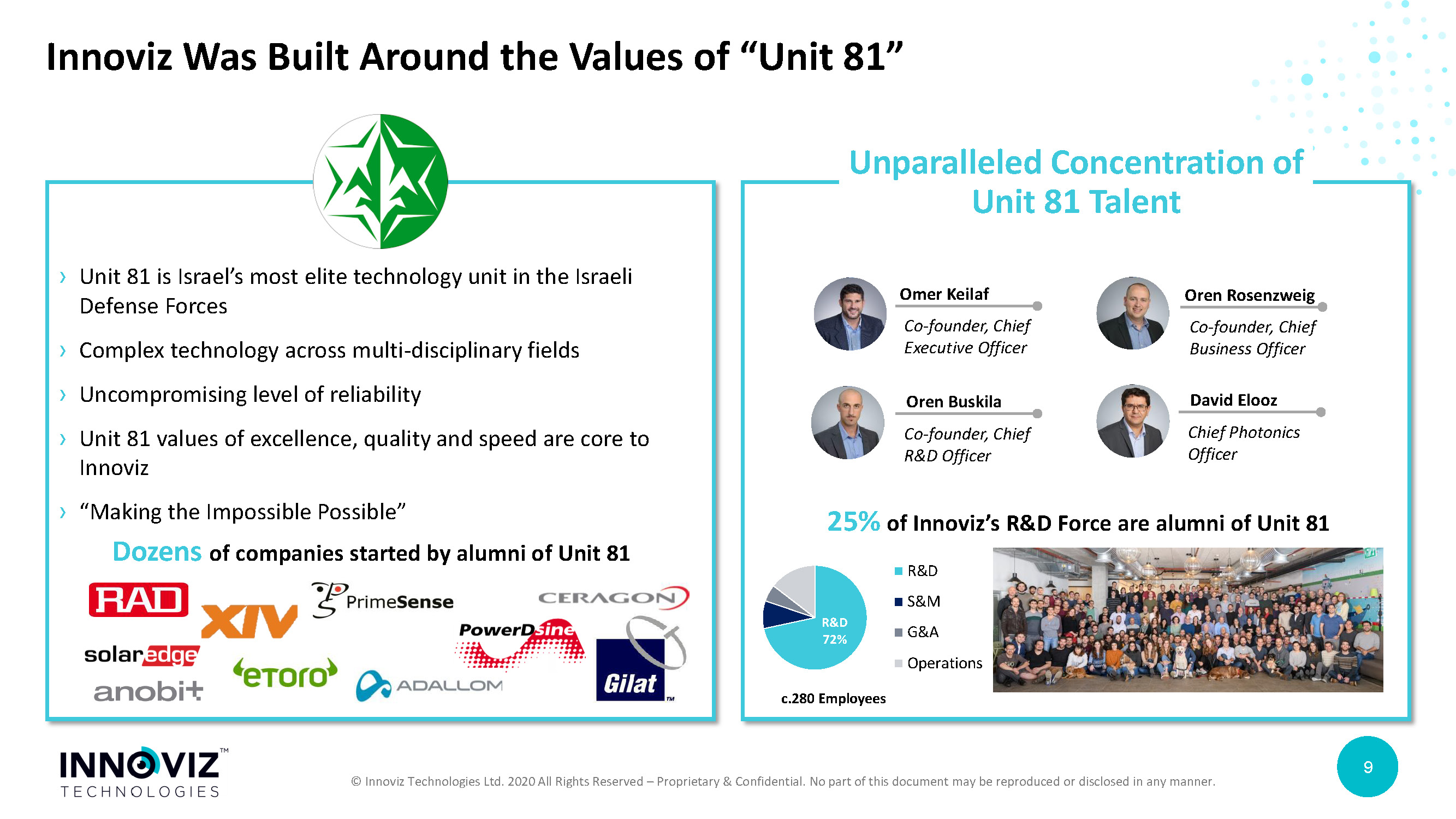 8 8 © Innoviz Technologies Ltd. 2020 All Rights Reserved – Proprietary & Confidential. No part of this document may be reproduced or disclosed in any manner. Innoviz at a Glance Global Presence c. 280 Employees Unique Offering InnovizOne Perception Partnerships with Tier 1 Companies and OEM Partners $251 Million Capital Raised 2016 2018 2017 2019 2020 Series A $9 Million Founded InnovizOne Announced Tier 1 Partnership Series B $73 Million Tier 1 Partnership Selection by BMW for Series Production Series C $169 Million Tier 1 Partnership C Samples Production Tier 1 Partnership InnovizTwo Announced