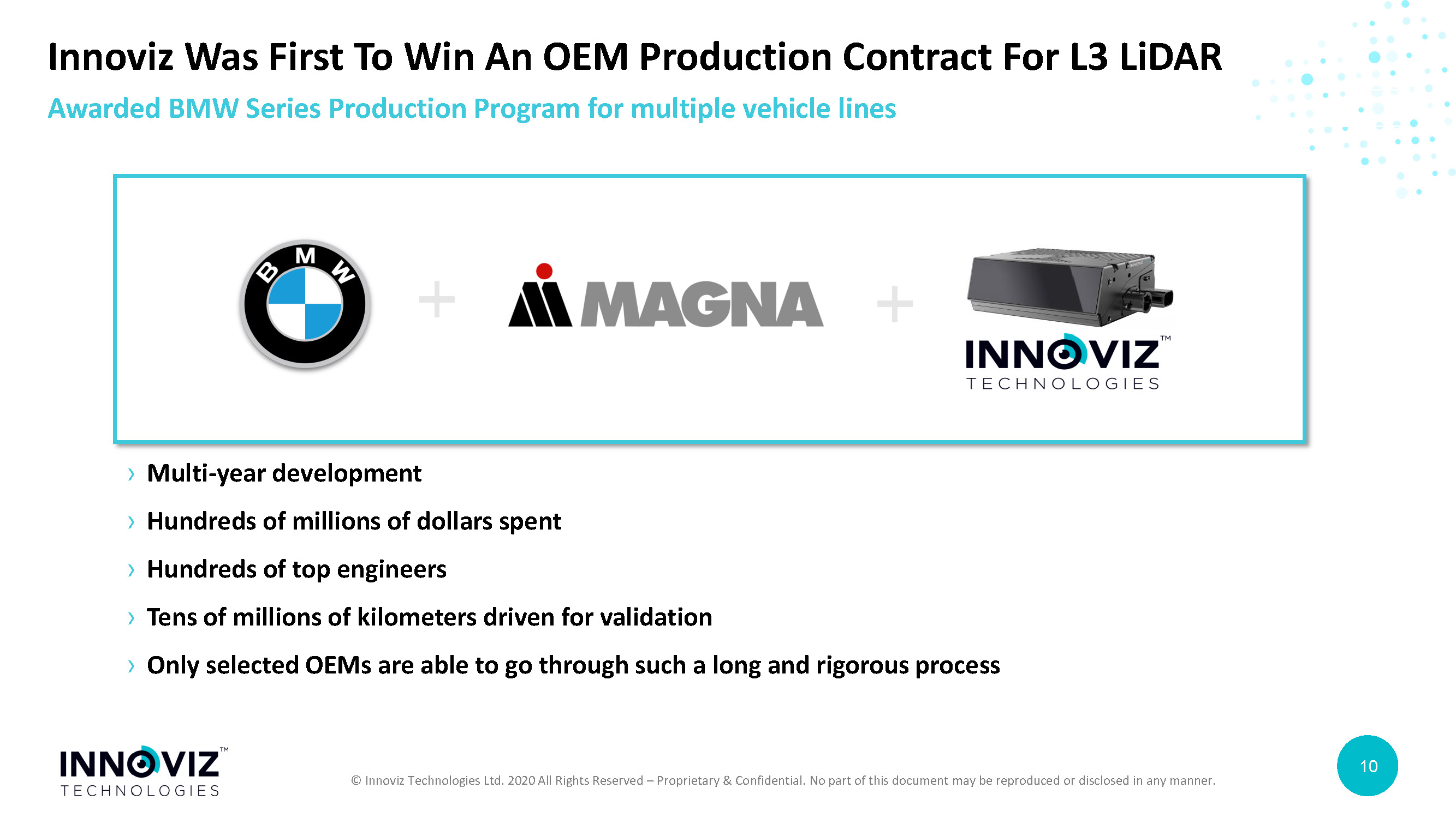 9 9 © Innoviz Technologies Ltd. 2020 All Rights Reserved – Proprietary & Confidential. No part of this document may be reproduced or disclosed in any manner. Innoviz Was Built Around the Values of “Unit 81” Unparalleled Concentration of Unit 81 Talent › Unit 81 is Israel’s most elite technology unit in the Israeli Defense Forces › Complex technology across multi - disciplinary fields › Uncompromising level of reliability › Unit 81 values of excellence, quality and speed are core to Innoviz › “Making the Impossible Possible” Oren Buskila Co - founder, Chief R&D Officer Oren Rosenzweig Co - founder, Chief Business Officer Omer Keilaf Co - founder, Chief Executive Officer David Elooz Chief Photonics Officer 25% of Innoviz’s R&D Force are alumni of Unit 81 Dozens of companies started by alumni of Unit 81 R&D S&M G&A Operations R&D 72 % c.280 Employees