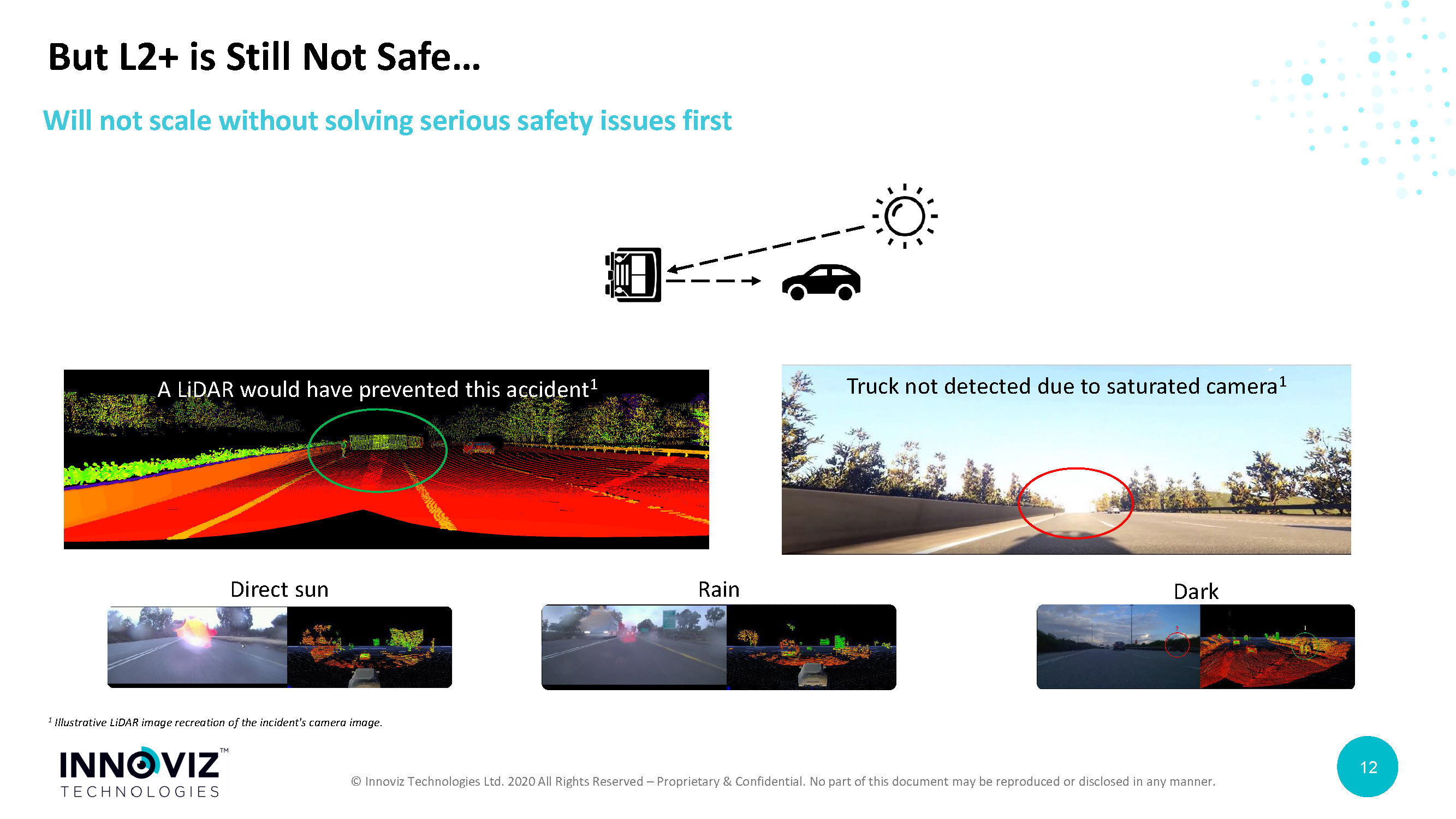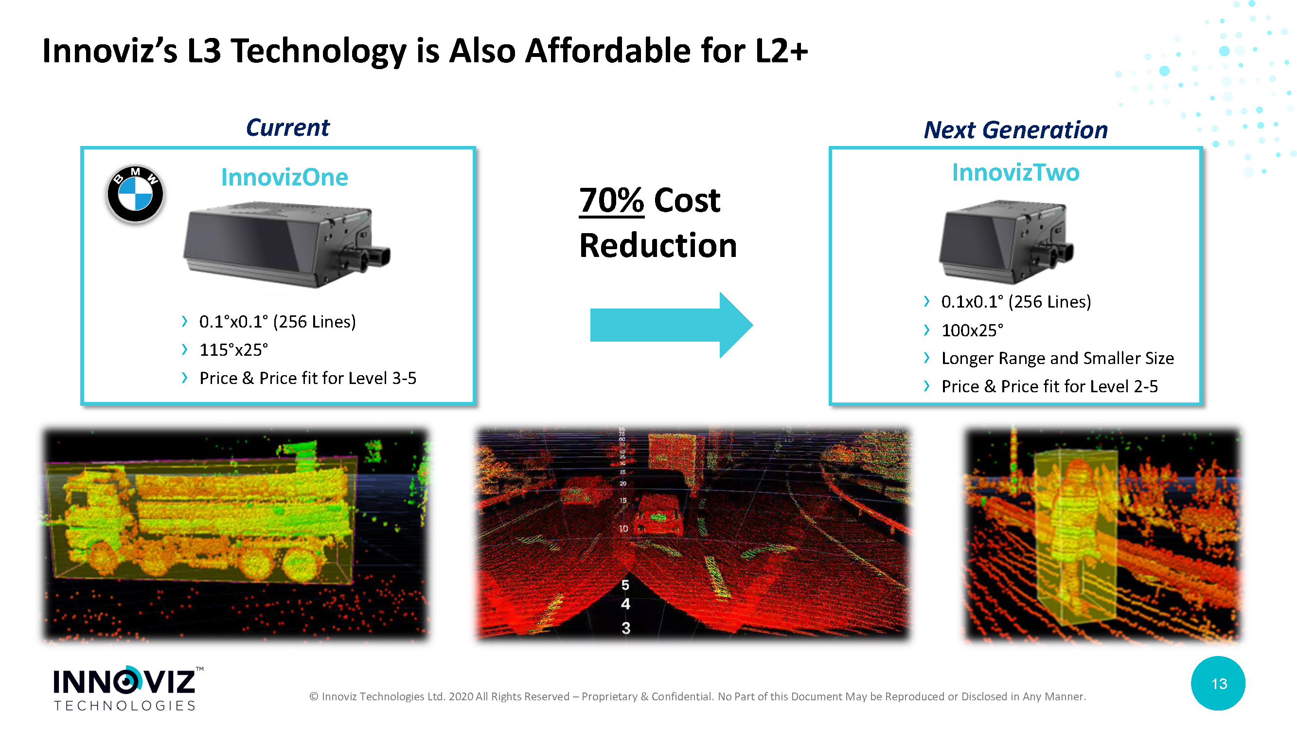 12 12 © Innoviz Technologies Ltd. 2020 All Rights Reserved – Proprietary & Confidential. No part of this document may be reproduced or disclosed in any manner. But L2+ is Still Not Safe… 1 Illustrative LiDAR image recreation of the incident's camera image. Truck not detected due to saturated camera 1 Driver trying to warn oncoming cars A LiDAR would have prevented this accident 1 Direct sun Rain Dark Will not scale without solving serious safety issues first