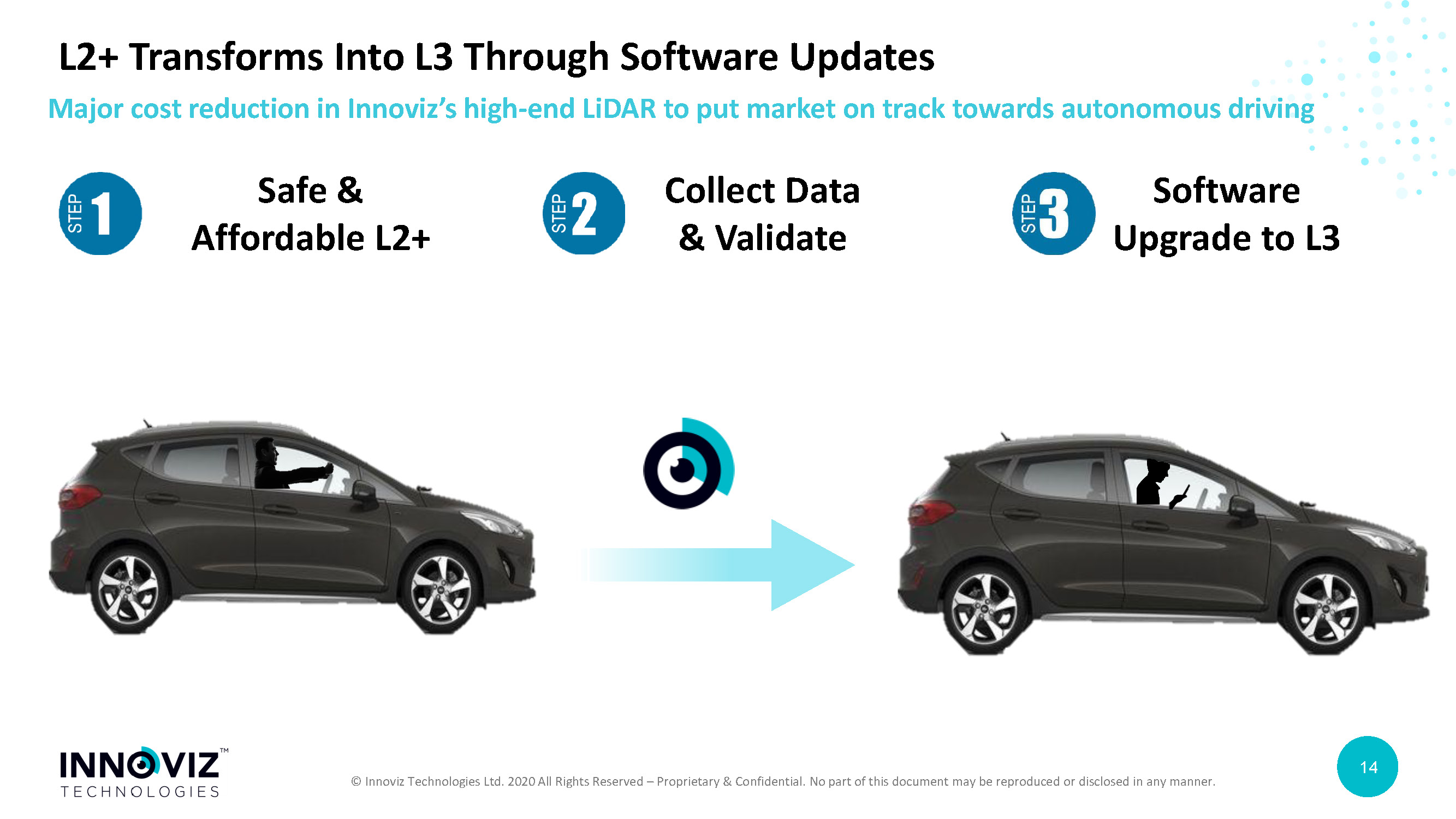 13 13 © Innoviz Technologies Ltd. 2020 All Rights Reserved – Proprietary & Confidential. No Part of this Document May be Reproduced or Disclosed in Any Manner. Innoviz’s L3 Technology is Also Affordable for L2+ InnovizOne InnovizTwo › 0.1 Σ x0.1 Σ (256 Lines) › 115 Σ x25 Σ › Price & Price fit for Level 3 - 5 Current Next Generation 70% Cost Reduction › 0.1x0.1 Σ (256 Lines) › 100x25 Σ › Longer Range and Smaller Size › Price & Price fit for Level 2 - 5