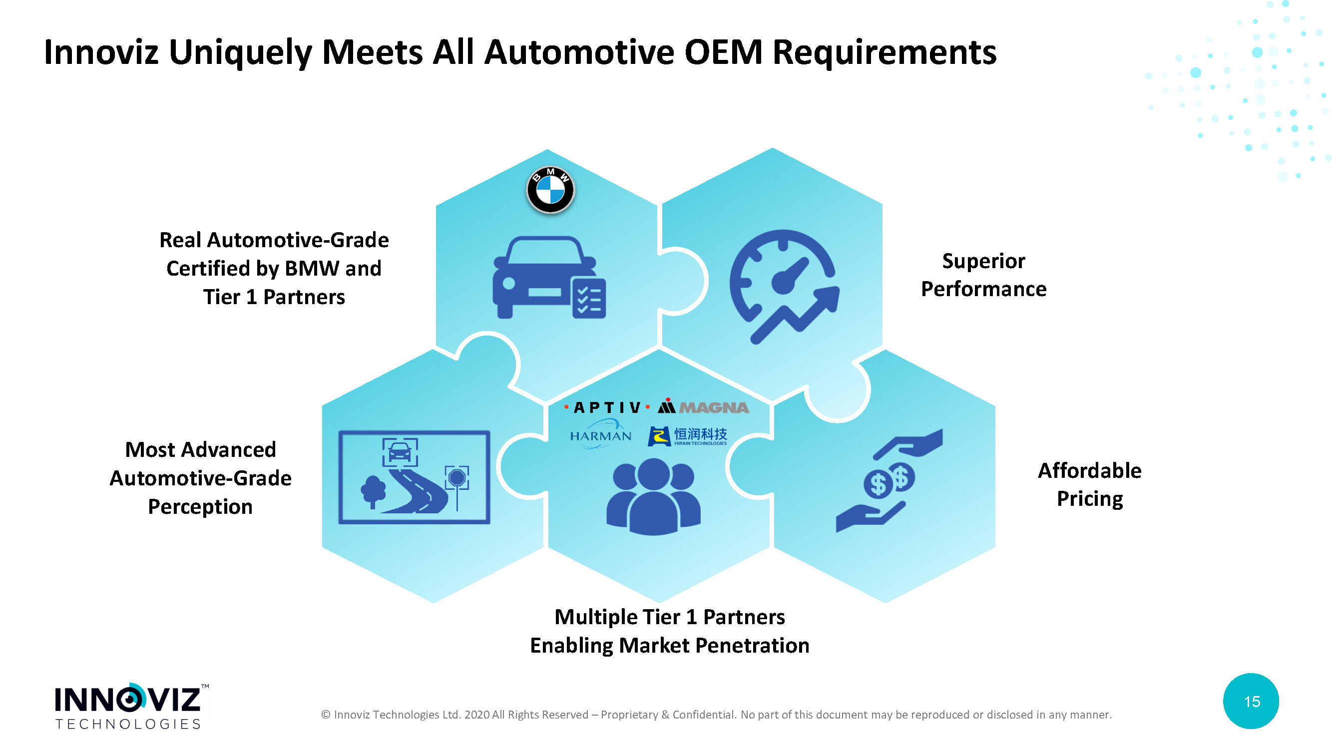 14 14 © Innoviz Technologies Ltd. 2020 All Rights Reserved – Proprietary & Confidential. No part of this document may be reproduced or disclosed in any manner. L2+ Transforms Into L3 Through Software Updates Major cost reduction in Innoviz’s high - end LiDAR to put market on track towards autonomous driving Safe & Affordable L2+ Collect Data & Validate Software Upgrade to L3