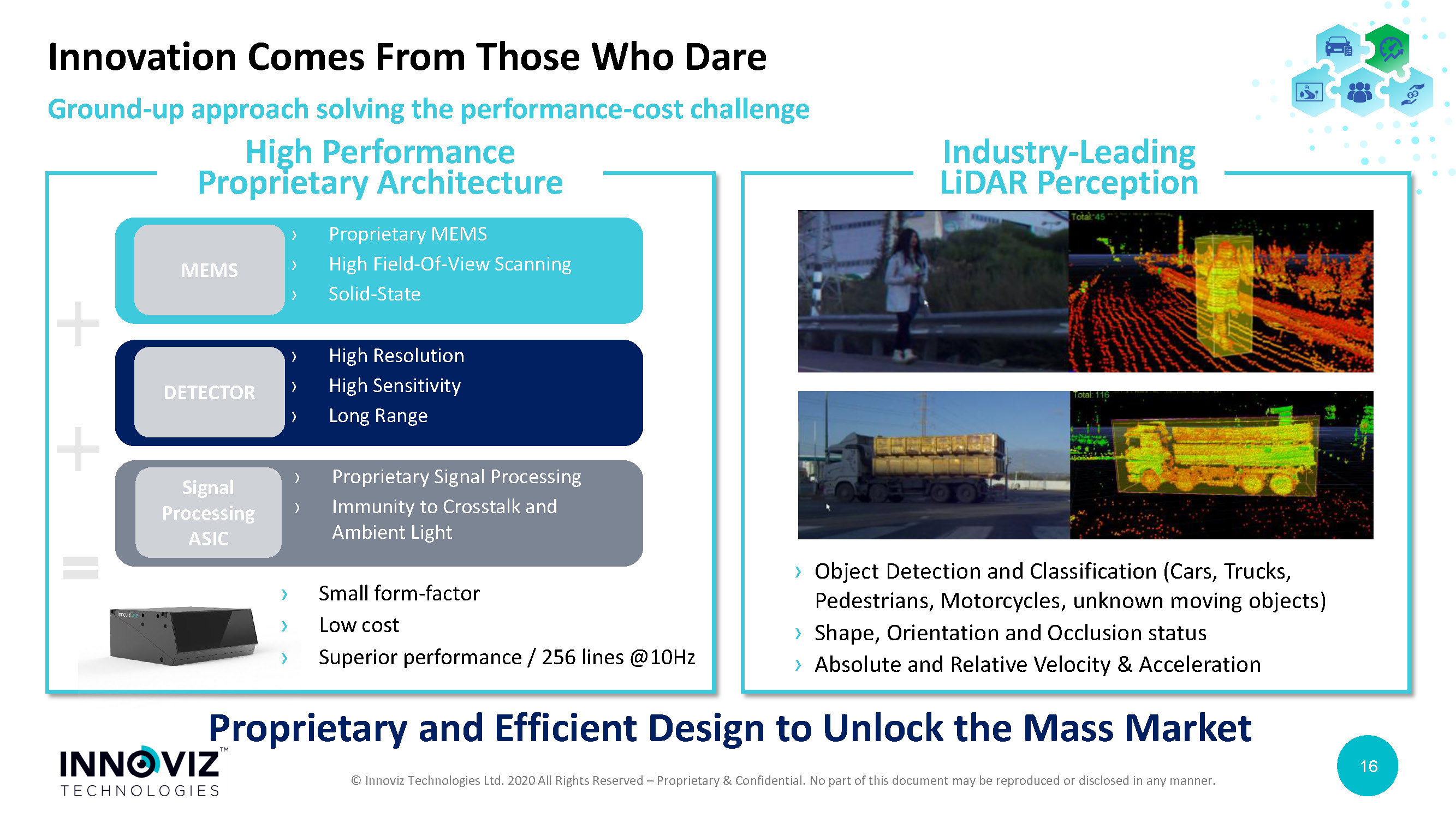 15 15 © Innoviz Technologies Ltd. 2020 All Rights Reserved – Proprietary & Confidential. No part of this document may be reproduced or disclosed in any manner. Innoviz Uniquely Meets All Automotive OEM Requirements Real Automotive - Grade Certified by BMW and Tier 1 Partners Superior Performance Most Advanced Automotive - Grade Perception Multiple Tier 1 Partners Enabling Market Penetration Affordable Pricing
