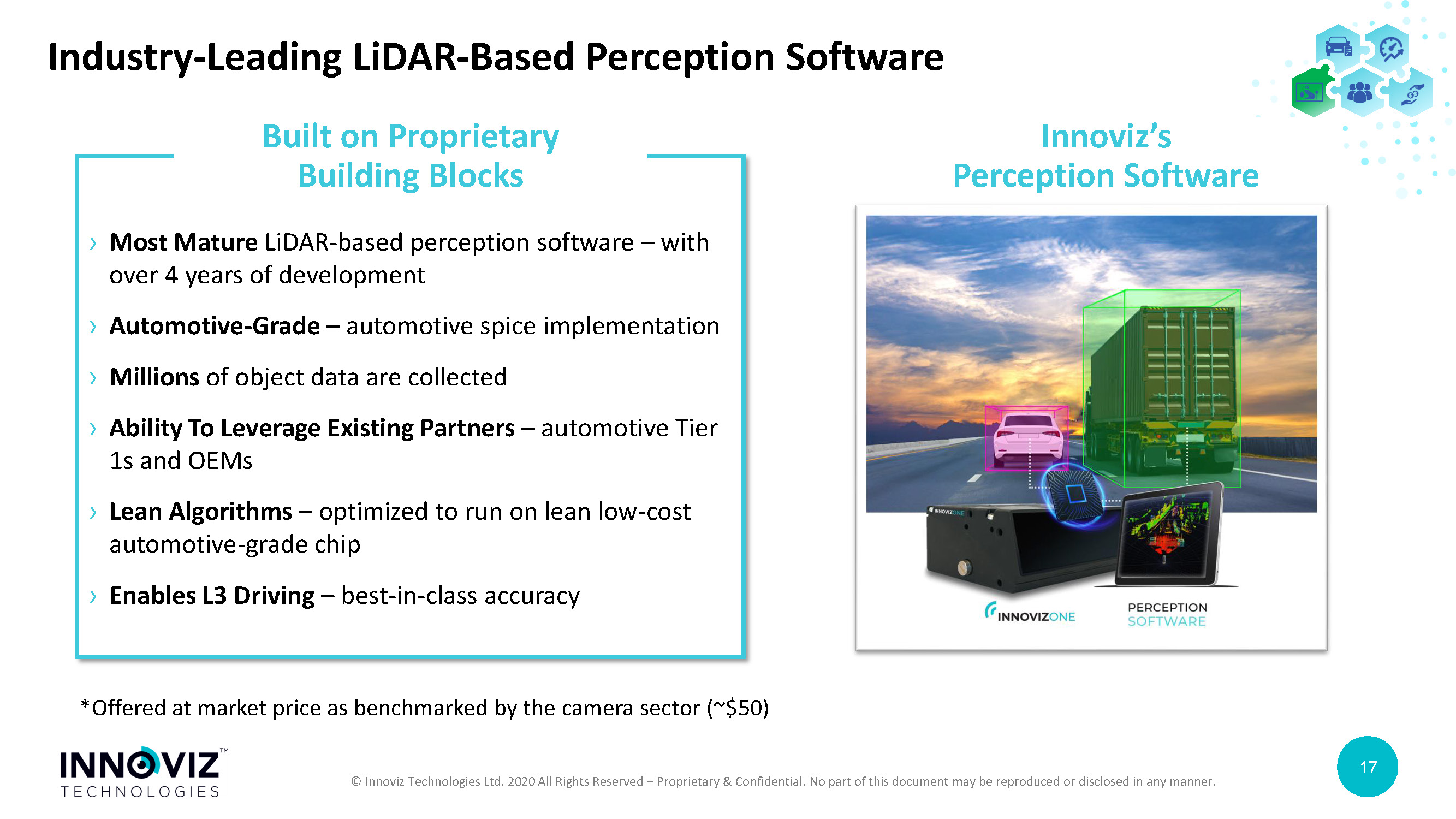 16 16 © Innoviz Technologies Ltd. 2020 All Rights Reserved – Proprietary & Confidential. No part of this document may be reproduced or disclosed in any manner. MEMS DETECTOR Innovation Comes From Those Who Dare › Proprietary MEMS › High Field - Of - View Scanning › Solid - State › Small form - factor › Low cost › Superior performance / 256 lines @10Hz Proprietary and Efficient Design to Unlock the Mass Market › High Resolution › High Sensitivity › Long Range › Proprietary Signal Processing › Immunity to Crosstalk and Ambient Light Signal Processing ASIC High Performance Proprietary Architecture › Object Detection and Classification (Cars, Trucks, Pedestrians, Motorcycles, unknown moving objects) › Shape, Orientation and Occlusion status › Absolute and Relative Velocity & Acceleration Industry - Leading LiDAR Perception Ground - up approach solving the performance - cost challenge