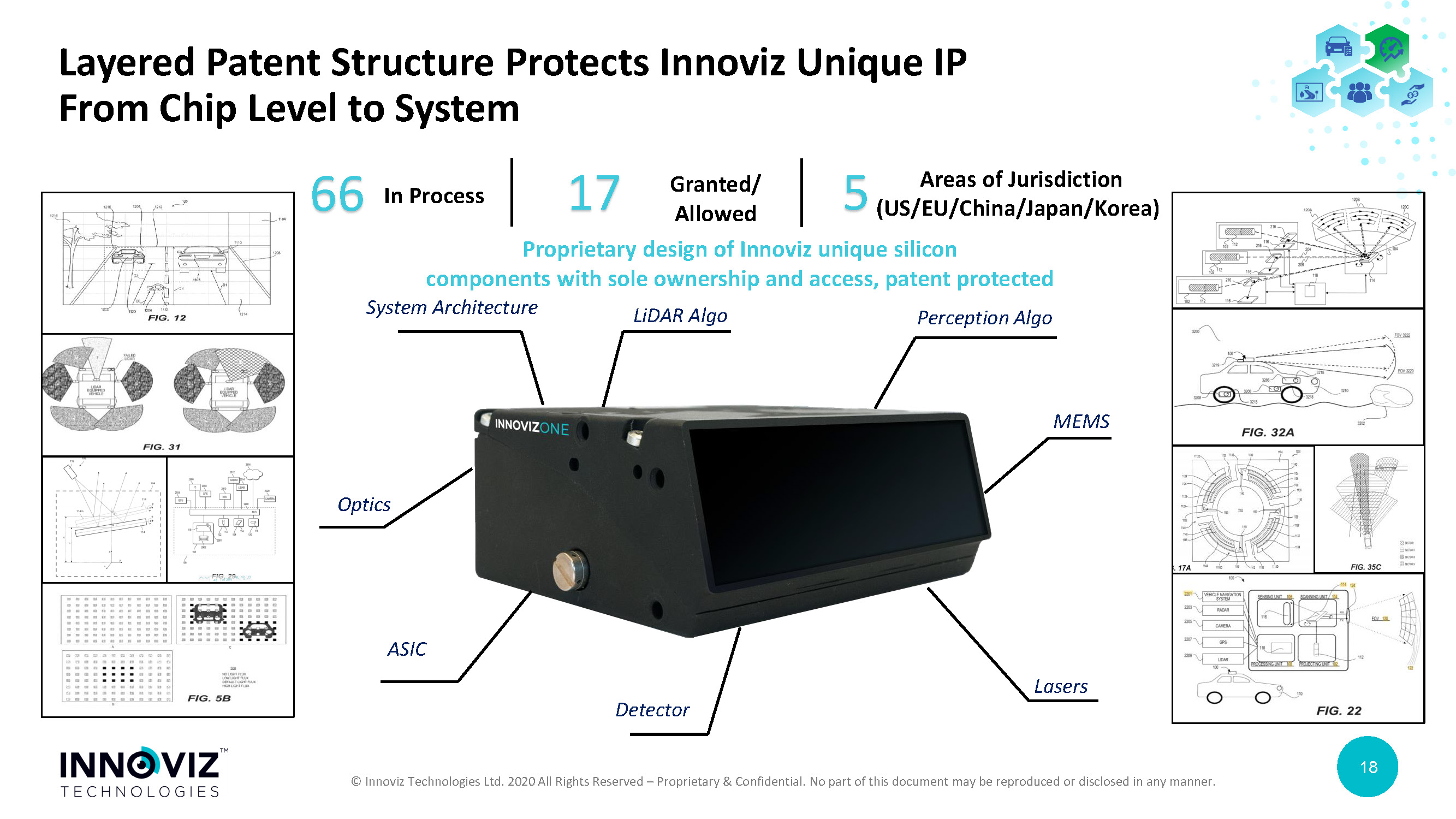 17 17 © Innoviz Technologies Ltd. 2020 All Rights Reserved – Proprietary & Confidential. No part of this document may be reproduced or disclosed in any manner. Industry - Leading LiDAR - Based Perception Software Innoviz’s Perception Software › Most Mature LiDAR - based perception software – with over 4 years of development › Automotive - Grade – automotive spice implementation › Millions of object data are collected › Ability To Leverage Existing Partners – automotive Tier 1s and OEMs › Lean Algorithms – optimized to run on lean low - cost automotive - grade chip › Enables L3 Driving – best - in - class accuracy Built on Proprietary Building Blocks *Offered at market price as benchmarked by the camera sector (~$50)