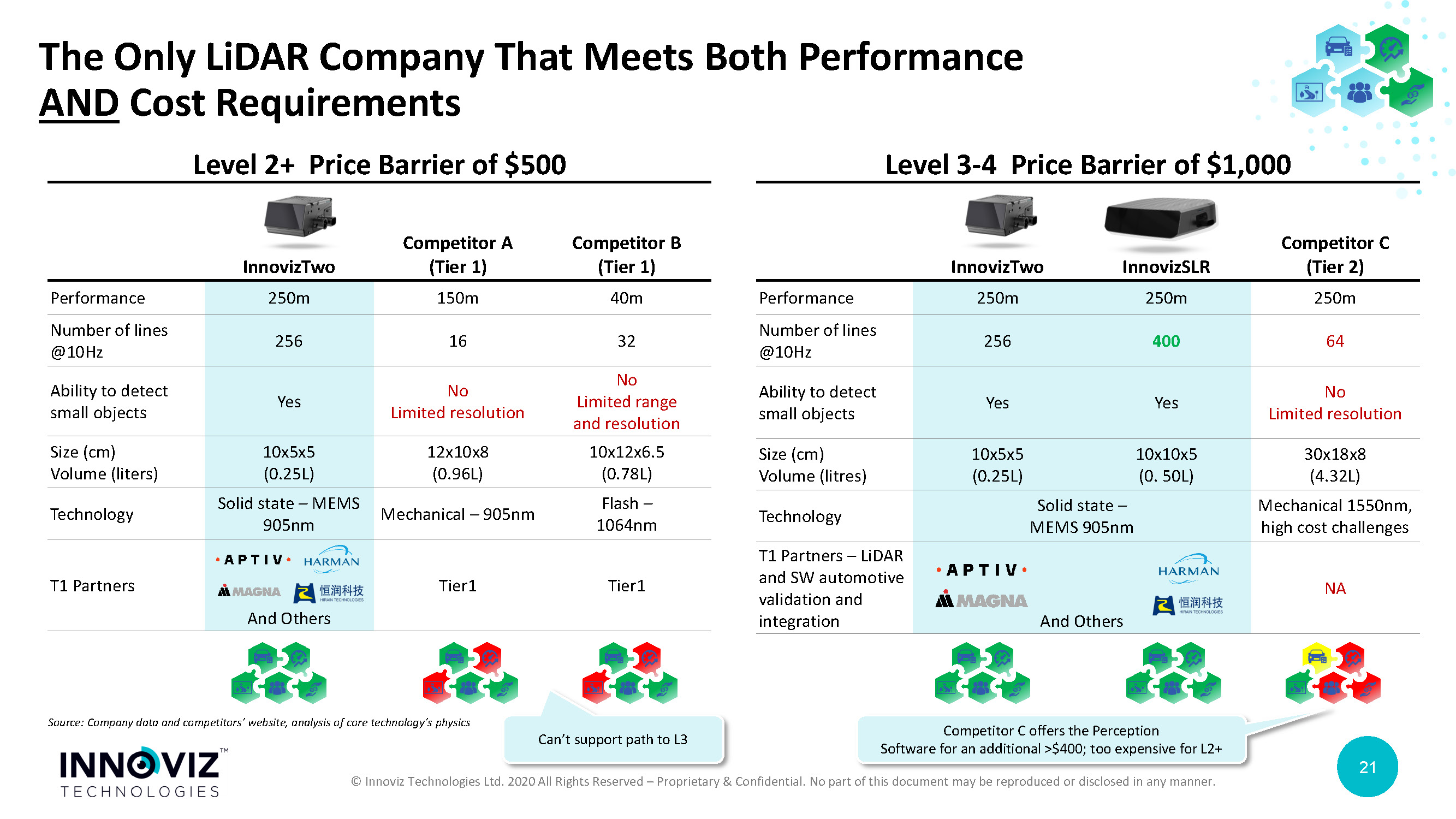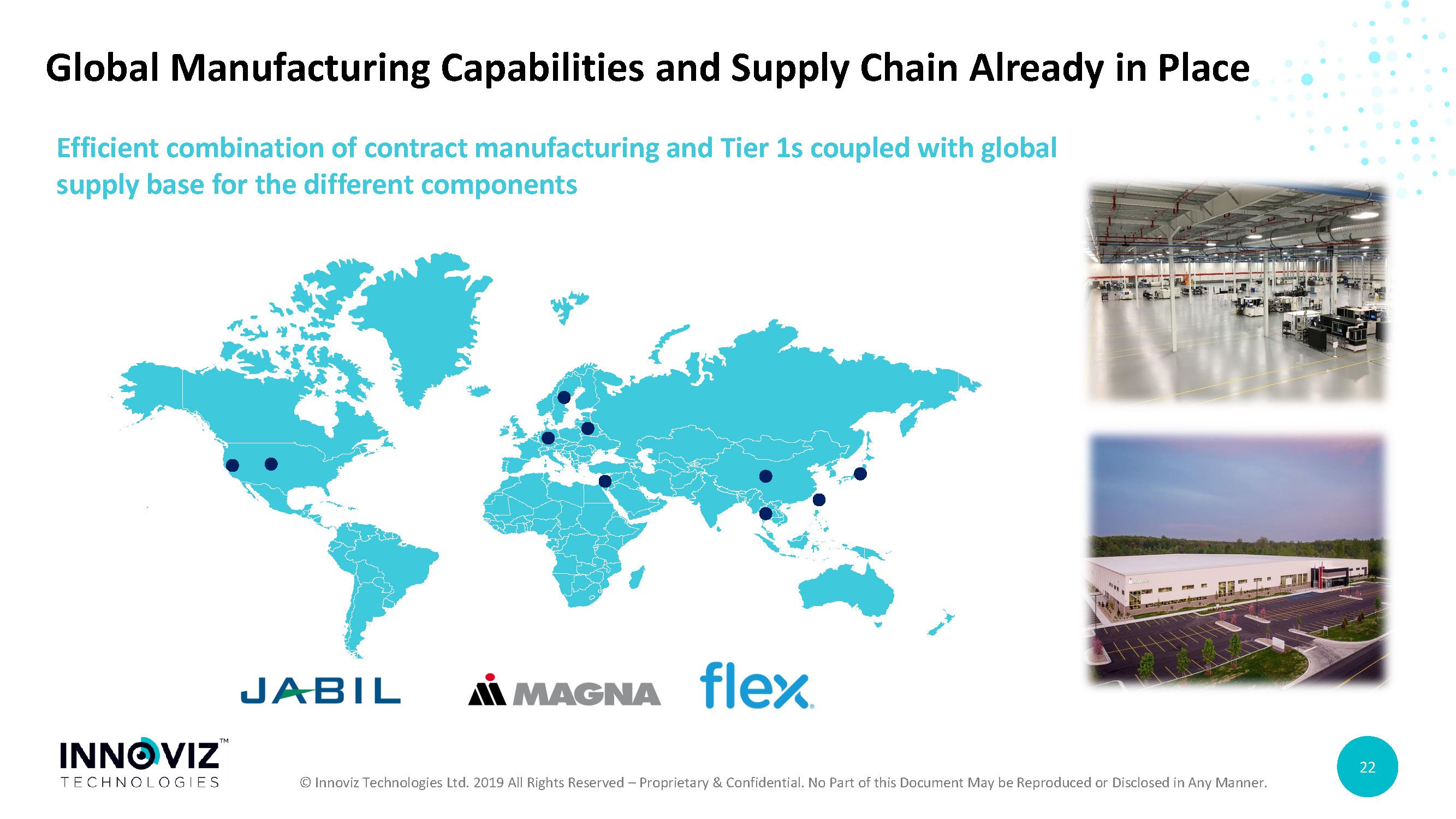 21 21 © Innoviz Technologies Ltd. 2020 All Rights Reserved – Proprietary & Confidential. No part of this document may be reproduced or disclosed in any manner. The Only LiDAR Company That Meets Both Performance AND Cost Requirements Level 2+ Price Barrier of $500 InnovizTwo Competitor A (Tier 1) Competitor B (Tier 1) Performance 250m 150m 40m Number of lines @10Hz 256 16 32 Ability to detect small objects Yes No Limited resolution No Limited range and resolution Size (cm ) Volume (liters) 10x5x5 (0.25L) 12x10x8 (0.96L) 10x12x6.5 (0.78L) Technology Solid state – MEMS 905nm Mechanical – 905nm Flash – 1064nm T1 Partners And Other s Tier1 Tier 1 Level 3 - 4 Price Barrier of $1,000 InnovizTwo InnovizSLR Competitor C (Tier 2) Performance 250m 250m 250m Number of lines @10Hz 256 400 64 Ability to detect small objects Yes Yes No Limited resolution Size (cm ) Volume (litres) 10x5x5 (0.25L) 10x10x5 (0. 50L) 30x18x8 (4.32L) Technology Solid state – MEMS 905nm Mechanical 1550nm, high cost challenges T1 Partners – LiDAR and SW automotive validation and integration And Others NA Competitor C offers the Perception Software for an additional >$400; too expensive for L2+ Can’t support path to L3 Source: Company data and competitors’ website, analysis of core technology’s physics
