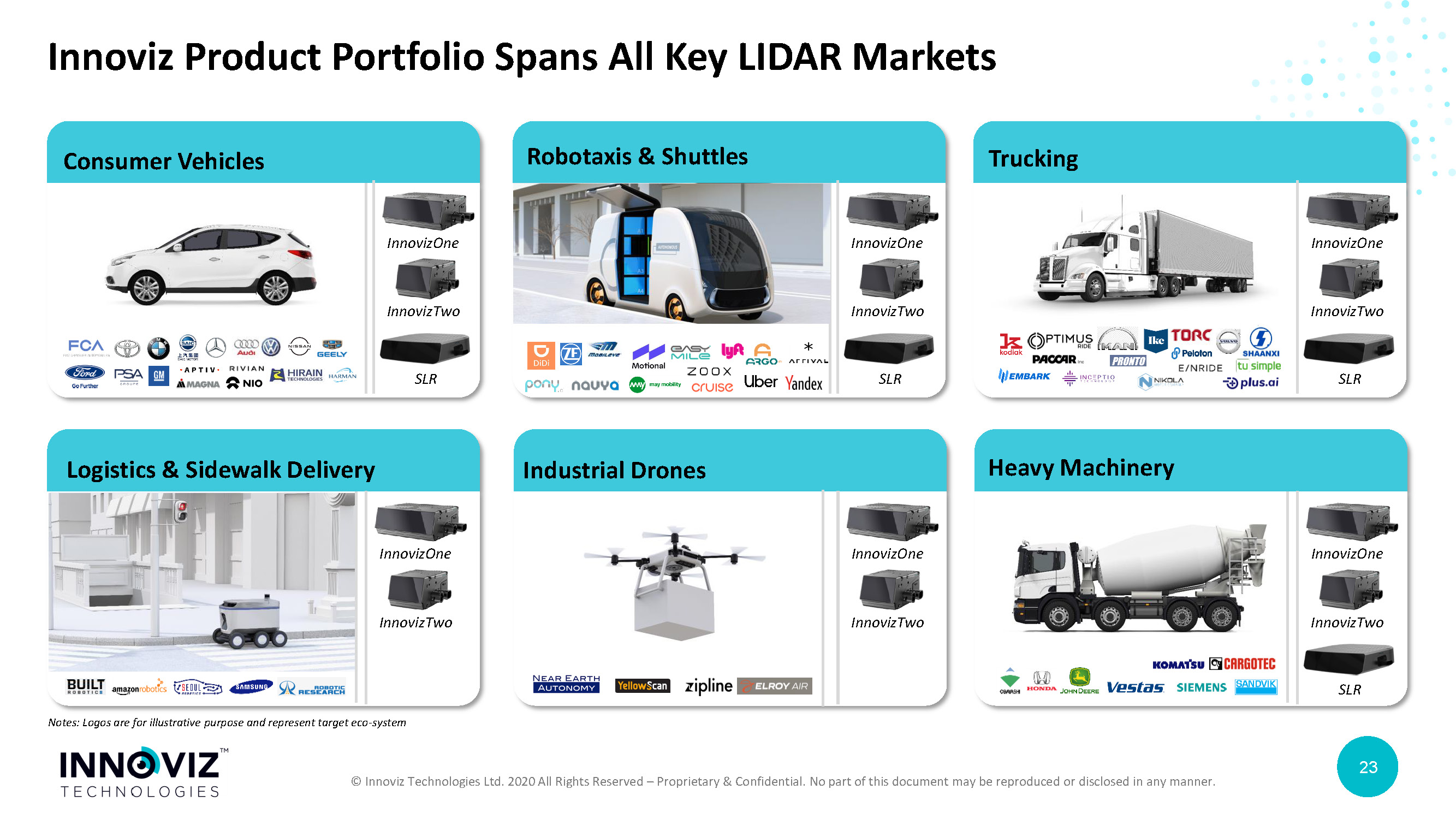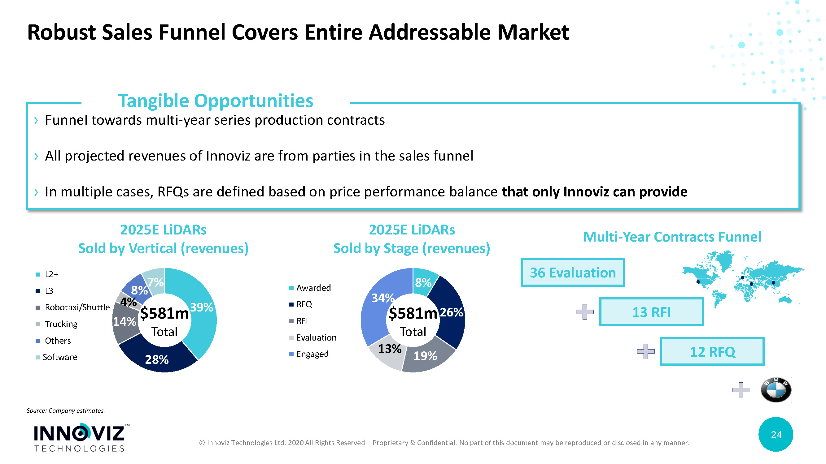 23 23 © Innoviz Technologies Ltd. 2020 All Rights Reserved – Proprietary & Confidential. No part of this document may be reproduced or disclosed in any manner. Innoviz Product Portfolio Spans All Key LIDAR Markets Heavy Machinery Industrial Drones Logistics & Sidewalk Delivery Notes: Logos are for illustrative purpose and represent target eco - system Consumer Vehicles Trucking SLR InnovizOne InnovizTwo Robotaxis & Shuttles SLR InnovizOne InnovizTwo SLR InnovizOne InnovizTwo InnovizOne InnovizTwo InnovizOne InnovizTwo SLR InnovizOne InnovizTwo