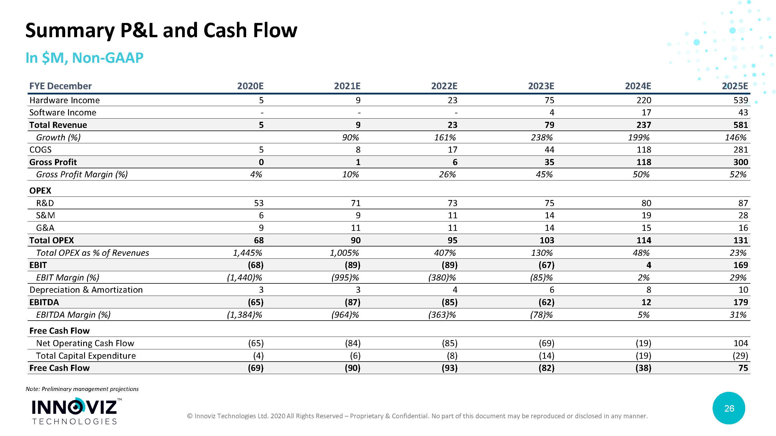 26 26 © Innoviz Technologies Ltd. 2020 All Rights Reserved – Proprietary & Confidential. No part of this document may be reproduced or disclosed in any manner. Summary P&L and Cash Flow Note: Preliminary management projections In $M, Non - GAAP FYE December 2020E 2021E 2022E 2023E 2024E 2025E Hardware Income 5 9 23 75 220 539 Software Income - - - 4 17 43 Total Revenue 5 9 23 79 237 581 Growth (%) 90% 161% 238% 199% 146% COGS 5 8 17 44 118 281 Gross Profit 0 1 6 35 118 300 Gross Profit Margin (%) 4% 10% 26% 45% 50% 52% OPEX R&D 53 71 73 75 80 87 S&M 6 9 11 14 19 28 G&A 9 11 11 14 15 16 Total OPEX 68 90 95 103 114 131 Total OPEX as % of Revenues 1,445% 1,005% 407% 130% 48% 23% EBIT (68) (89) (89) (67) 4 169 EBIT Margin (%) (1,440)% (995)% (380)% (85)% 2% 29% Depreciation & Amortization 3 3 4 6 8 10 EBITDA (65) (87) (85) (62) 12 179 EBITDA Margin (%) (1,384)% (964)% (363)% (78)% 5% 31% Free Cash Flow Net Operating Cash Flow (65) (84) (85) (69) (19) 104 Total Capital Expenditure (4) (6) (8) (14) (19) (29) Free Cash Flow (69) (90) (93) (82) (38) 75 v1v2 v3 v4v5v6