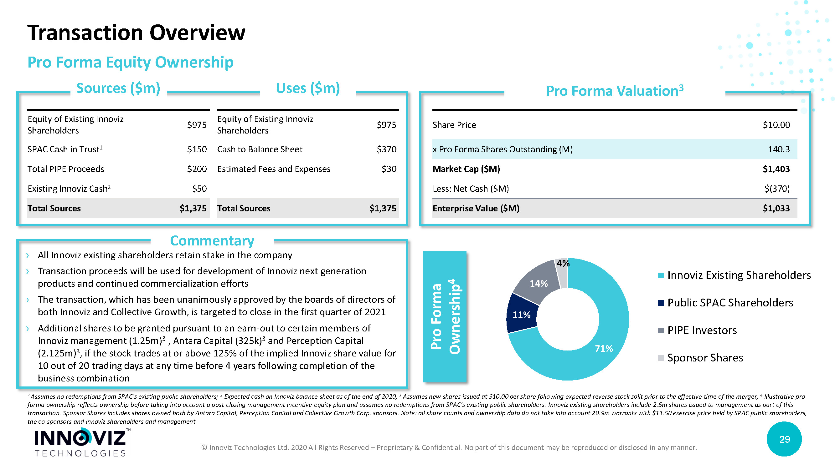 29 29 © Innoviz Technologies Ltd. 2020 All Rights Reserved – Proprietary & Confidential. No part of this document may be reproduced or disclosed in any manner. Transaction Overview ¹ Assumes no redemptions from SPAC’s existing public shareholders; 2 Expected cash on Innoviz balance sheet as of the end of 2020; 3 Assumes new shares issued at $10.00 per share following expected reverse stock split prior to the effective time of the merge r; 4 Illustrative pro forma ownership reflects ownership before taking into account a post - closing management incentive equity plan and assumes no red emptions from SPAC’s existing public shareholders. Innoviz existing shareholders include 2.5m shares issued to management as part of this transaction. Sponsor Shares includes shares owned both by Antara Capital , Perception Capital and Collective Growth Corp. sponsors. Note: all share counts and ownership data do not take into account 20.9m warrants with $11.50 exercise price held by SPAC pub lic shareholders, the co - sponsors and Innoviz shareholders and management Pro Forma Equity Ownership Share Price $10.00 x Pro Forma Shares Outstanding (M) 140.3 Mark et Cap ($M) $1,403 Less: Net Cash ($M) $( 370) Enterprise Value ($M) $ 1,033 Equity of Existing Innoviz Shareholders $975 SPAC Cash in Trust 1 $150 Total PIPE Proceeds $200 Existing Innoviz Cash 2 $50 Total Sources $1,375 Equity of Existing Innoviz Shareholders $975 Cash to Balance Sheet $ 370 Estimated Fees and Expenses $30 Total Sources $1,375 Sources ($m) Uses ($m) Pro Forma Valuation 3 Commentary 71% 11% 14% 4% Innoviz Existing Shareholders Public SPAC Shareholders PIPE Investors Sponsor Shares Pro Forma Ownership 4 › All Innoviz existing shareholders retain stake in the company › Transaction proceeds will be used for development of Innoviz next generation products and continued commercialization efforts › The transaction, which has been unanimously approved by the boards of directors of both Innoviz and Collective Growth, is targeted to close in the first quarter of 2021 › Additional shares to be granted pursuant to an earn - out to certain members of Innoviz management (1.25m) 3 , Antara Capital (325k) 3 and Perception Capital ( 2.125m) 3 , if the stock trades at or above 125% of the implied Innoviz share value for 10 out of 20 trading days at any time before 4 years following completion of the business combination