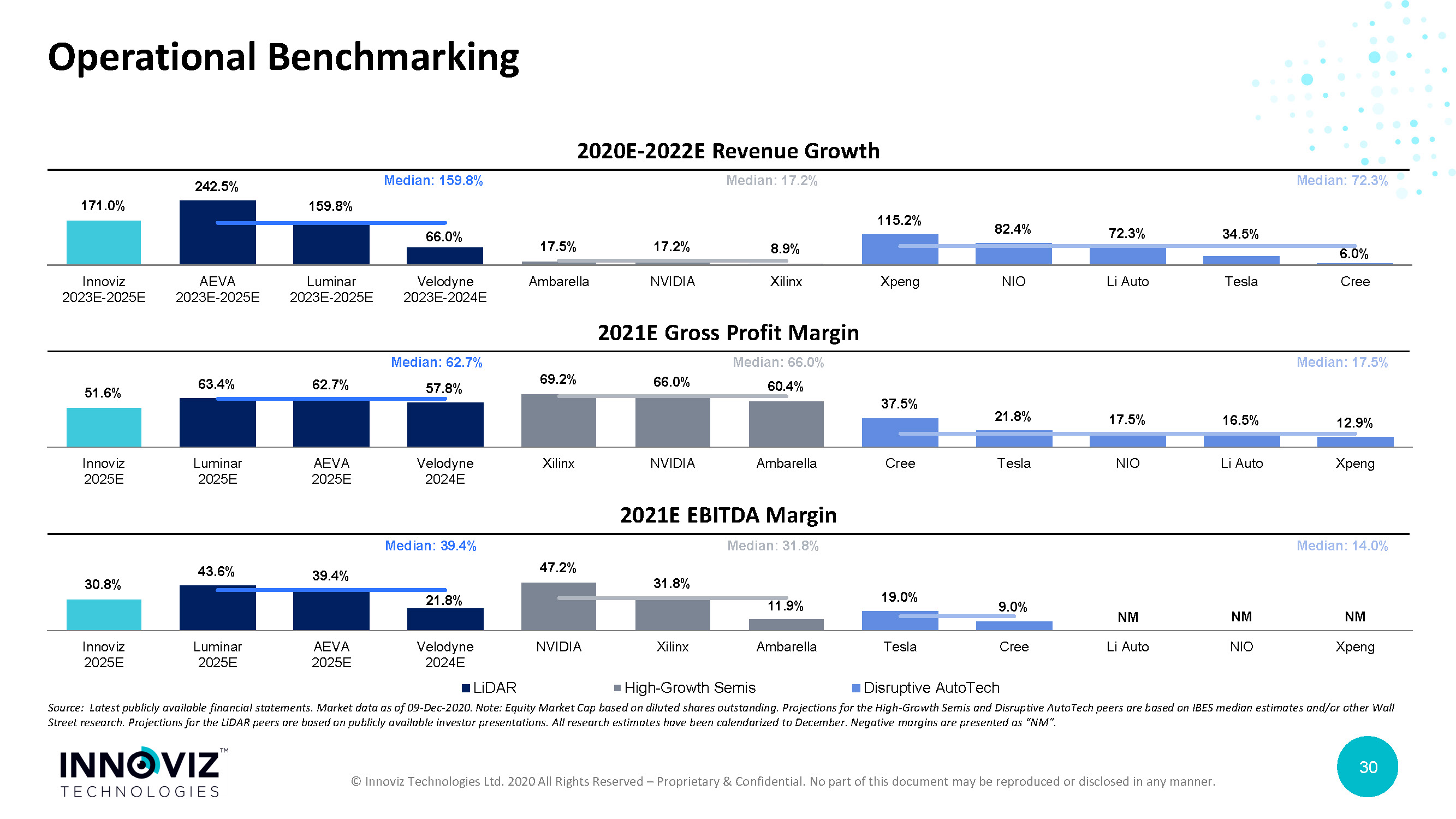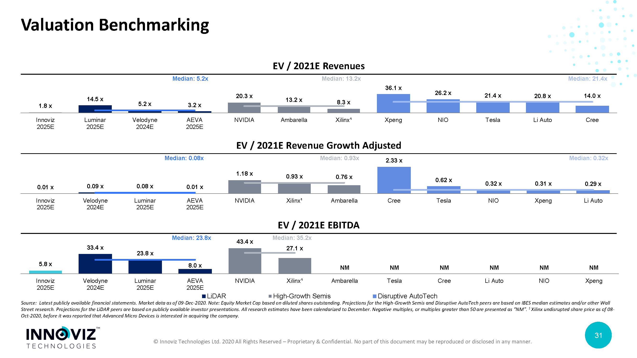 30 30 © Innoviz Technologies Ltd. 2020 All Rights Reserved – Proprietary & Confidential. No part of this document may be reproduced or disclosed in any manner. Operational Benchmarking 2020E - 2022E Revenue Growth Source: Latest publicly available financial statements. Market data as of 09 - Dec - 2020 . Note: Equity Market Cap based on diluted shares outstanding. Projections for the High - Growth Semis and Disruptive AutoTech pee rs are based on IBES median estimates and/or other Wall Street research. Projections for the LiDAR peers are based on publicly available investor presentations. All research estimat es have been calendarized to December. Negative margins are presented as “NM”. 2021E Gross Profit Margin 2021E EBITDA Margin LiDAR High-Growth Semis Disruptive AutoTech 171.0% 242.5% 159.8% 66.0% 17.5% 17.2% 8.9% 115.2% 82.4% 72.3% 34.5% 6.0% Innoviz 2023E-2025E AEVA 2023E-2025E Luminar 2023E-2025E Velodyne 2023E-2024E Ambarella NVIDIA Xilinx Xpeng NIO Li Auto Tesla Cree Median: 17.2% Median: 159.8% Median: 72.3% 51.6% 63.4% 62.7% 57.8% 69.2% 66.0% 60.4% 37.5% 21.8% 17.5% 16.5% 12.9% Innoviz 2025E Luminar 2025E AEVA 2025E Velodyne 2024E Xilinx NVIDIA Ambarella Cree Tesla NIO Li Auto Xpeng Median: 66.0% Median: 62.7% Median: 17.5% 30.8% 43.6% 39.4% 21.8% 47.2% 31.8% 11.9% 19.0% 9.0% NM NM NM Innoviz 2025E Luminar 2025E AEVA 2025E Velodyne 2024E NVIDIA Xilinx Ambarella Tesla Cree Li Auto NIO Xpeng Median: 31.8% Median: 39.4% Median: 14.0%