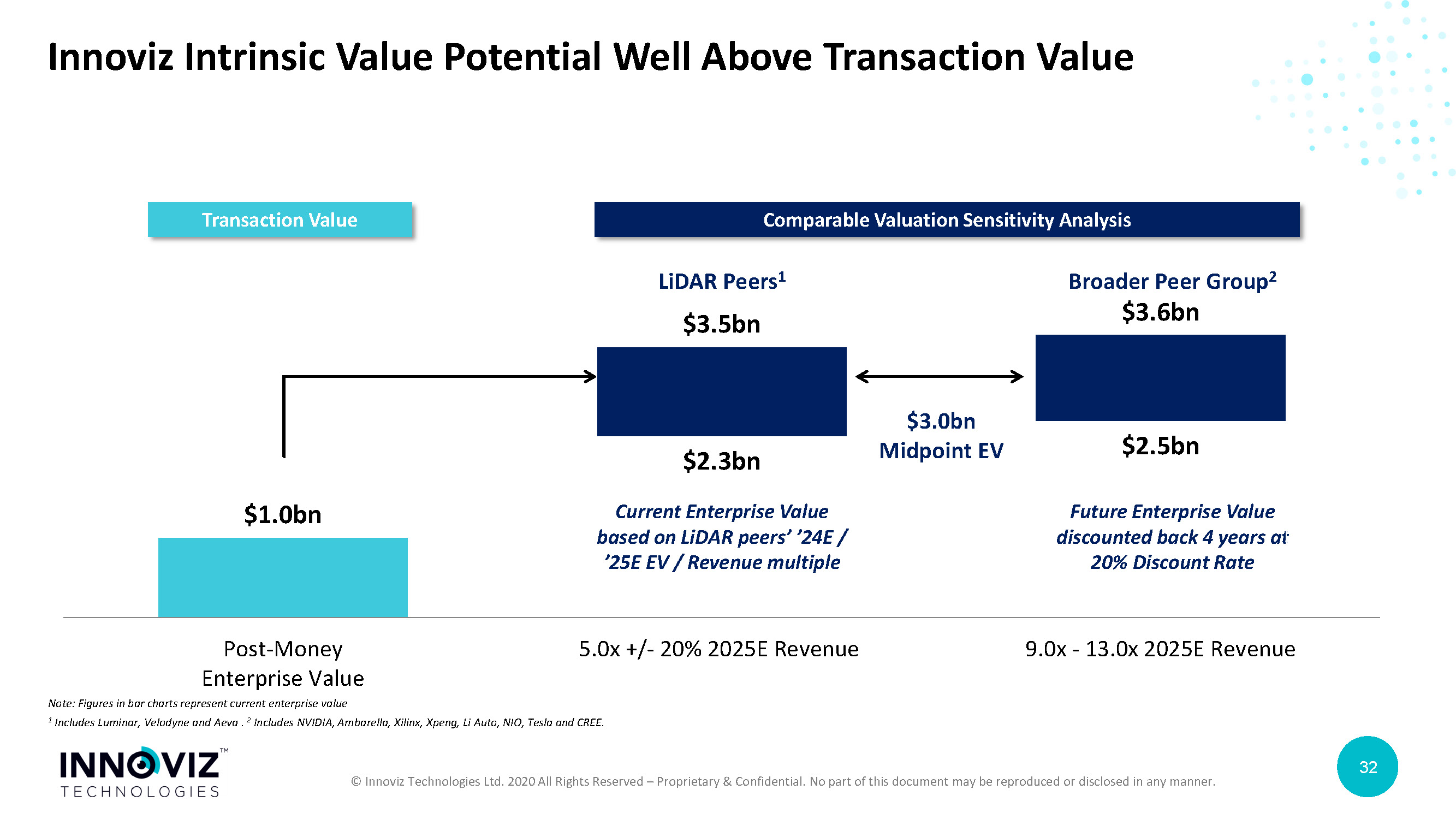 31 31 © Innoviz Technologies Ltd. 2020 All Rights Reserved – Proprietary & Confidential. No part of this document may be reproduced or disclosed in any manner. Valuation Benchmarking EV / 2021E Revenues Source: Latest publicly available financial statements. Market data as of 09 - Dec - 2020 . Note: Equity Market Cap based on diluted shares outstanding. Projections for the High - Growth Semis and Disruptive AutoTech pee rs are based on IBES median estimates and/or other Wall Street research. Projections for the LiDAR peers are based on publicly available investor presentations. All research estimat es have been calendarized to December. Negative multiples, or multiples greater than 50 are presented as “NM”. 1 Xilinx undisrupted share price as of 08 - Oct - 2020, before it was reported that Advanced Micro Devices is interested in acquiring the company. EV / 2021E Revenue Growth Adjusted EV / 2021E EBITDA LiDAR High-Growth Semis Disruptive AutoTech 1.8 x 14.5 x 5.2 x 3.2 x 20.3 x 13.2 x 8.3 x 36.1 x 26.2 x 21.4 x 20.8 x 14.0 x Innoviz 2025E Luminar 2025E Velodyne 2024E AEVA 2025E NVIDIA Ambarella Xilinx¹ Xpeng NIO Tesla Li Auto Cree Median: 13.2x Median: 5.2x Median: 21.4x 0.01 x 0.09 x 0.08 x 0.01 x 1.18 x 0.93 x 0.76 x 2.33 x 0.62 x 0.32 x 0.31 x 0.29 x Innoviz 2025E Velodyne 2024E Luminar 2025E AEVA 2025E NVIDIA Xilinx¹ Ambarella Cree Tesla NIO Xpeng Li Auto Median: 0.93x Median: 0.08x Median: 0.32x 5.8 x 33.4 x 23.8 x 8.0 x 43.4 x 27.1 x NM NM NM NM NM NM Innoviz 2025E Velodyne 2024E Luminar 2025E AEVA 2025E NVIDIA Xilinx¹ Ambarella Tesla Cree Li Auto NIO Xpeng Median: 35.2x Median: 23.8x