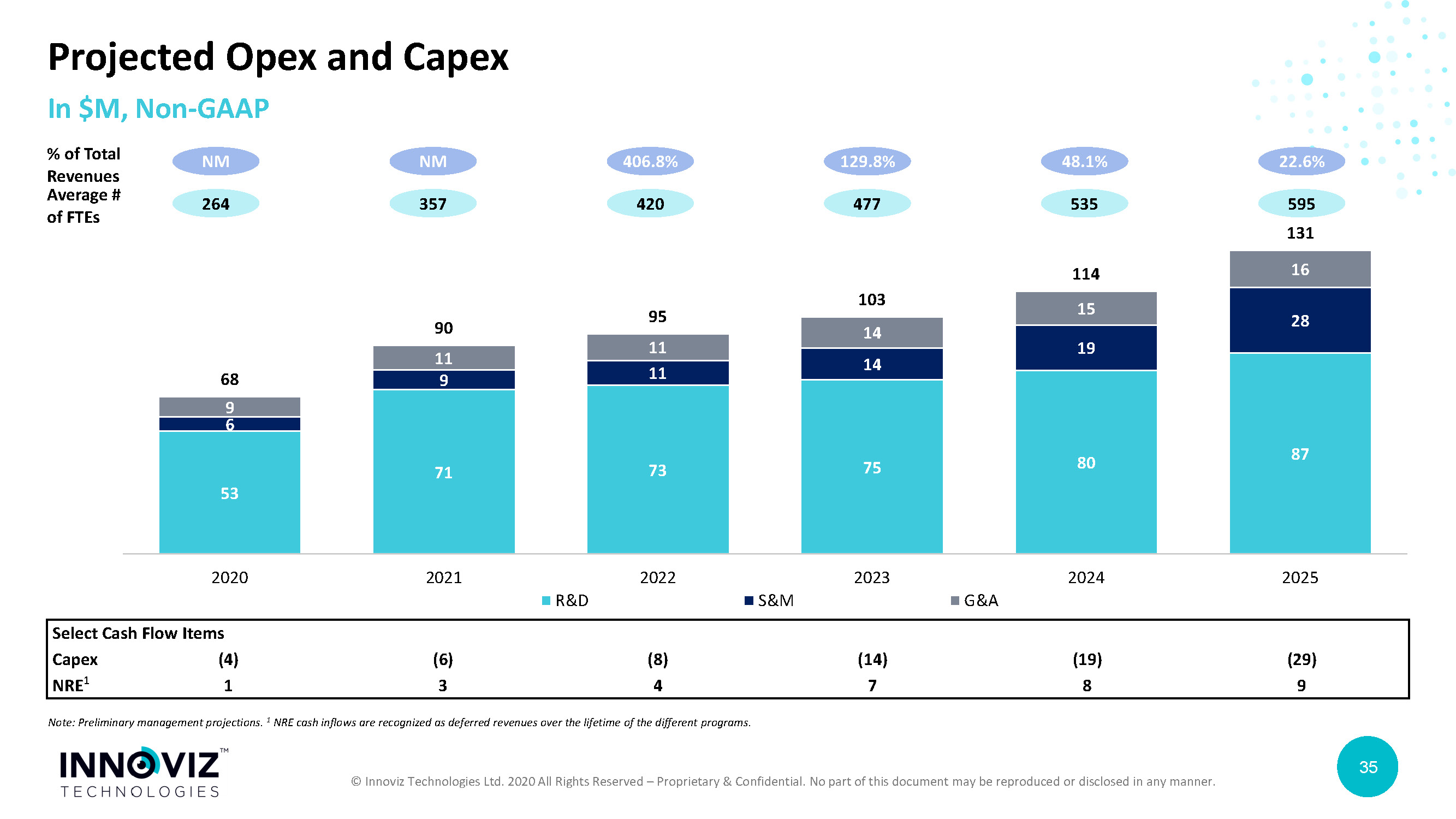 35 35 © Innoviz Technologies Ltd. 2020 All Rights Reserved – Proprietary & Confidential. No part of this document may be reproduced or disclosed in any manner. Projected Opex and Capex In $M, Non - GAAP Select Cash Flow Items Capex (4) (6) (8) (14) (19) (29) NRE 1 1 3 4 7 8 9 Note: Preliminary management projections. 1 NRE cash inflows are recognized as deferred revenues over the lifetime of the different programs. 53 71 73 75 80 87 6 9 11 14 19 28 9 11 11 14 15 16 68 90 95 103 114 131 2020 2021 2022 2023 2024 2025 R&D S&M G&A NM 264 % of Total Revenues Average # of FTEs NM 357 406.8% 420 129.8% 477 48.1% 535 22.6% 595 r125